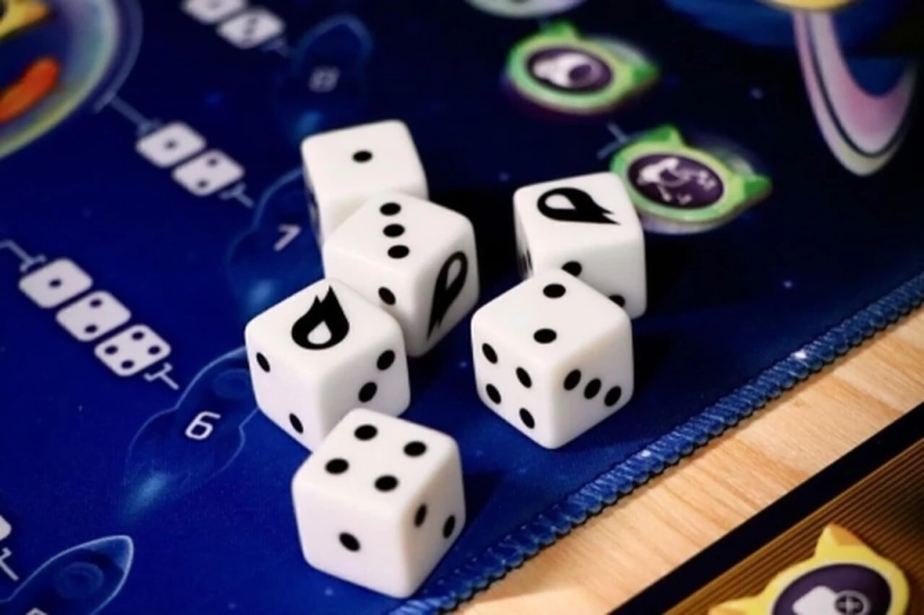 O jogador então rola seis dados e (idealmente) escolhe todos os dados de um valor que corresponda a um valor listado para a localização atual da nave espacial. No espaço inicial, por exemplo, você pode escolher 1s, 2s ou cometas. Você move a espaçonave para a frente igual à soma dos dados escolhidos, então decide abandonar a nave - colocando seu miaustronauta na lua ou planeta próximo ao seu espaço - ou continuar seguindo em frente. Cada outro jogador também pode abandonar o navio, desde que haja espaço. (Cada lua pode conter apenas um miaustronauta, pelo qual o jogador recebe uma quantidade fixa de pontos, enquanto os planetas podem conter qualquer número de miaustronautas, com pontos sendo concedidos no final do jogo com base na pontuação da maioria.)